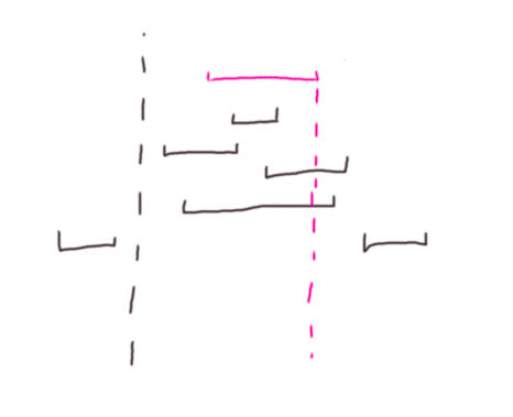 我们首先处理 黑色虚线左边的情况,之后处理虚线之间的, 最后处理右边的